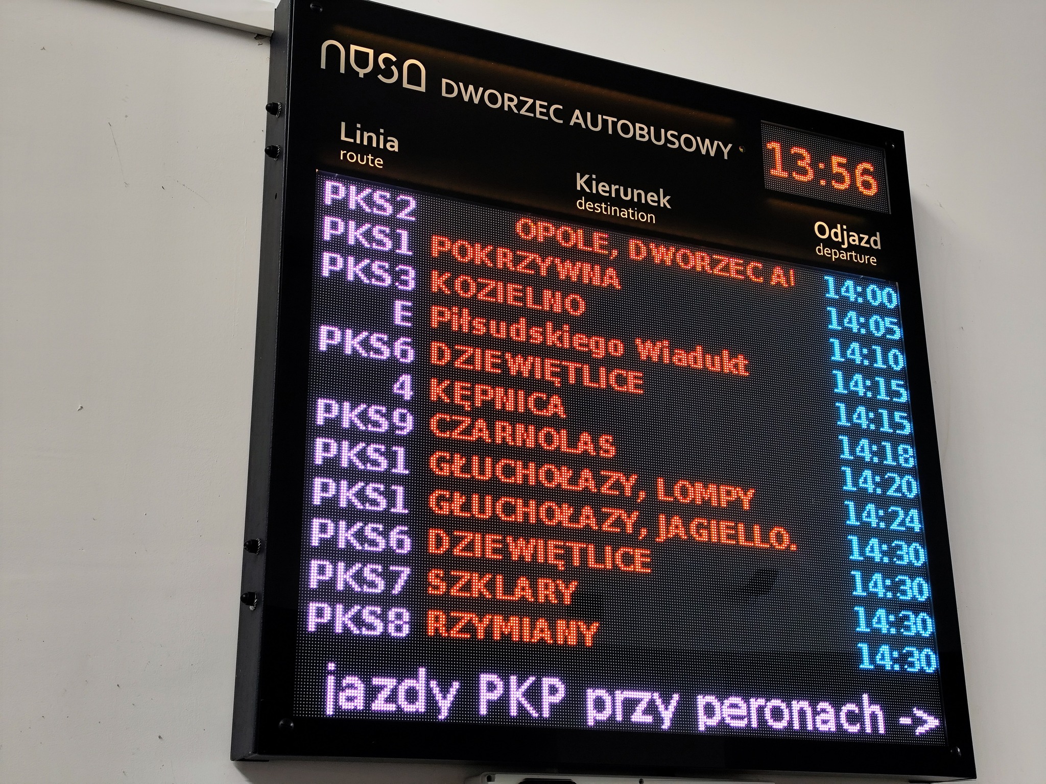 Obecnie wchodząc na teren Centrum Przesiadkowego tablica wyświetla tylko godzinę oraz informację, że rozkład jazdy pociągów znajduje się przy peronach. Na szczęście póki co działają tablice przy poszczególnych stanowiskach autobusowych.
