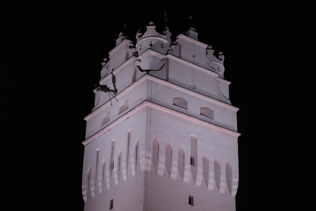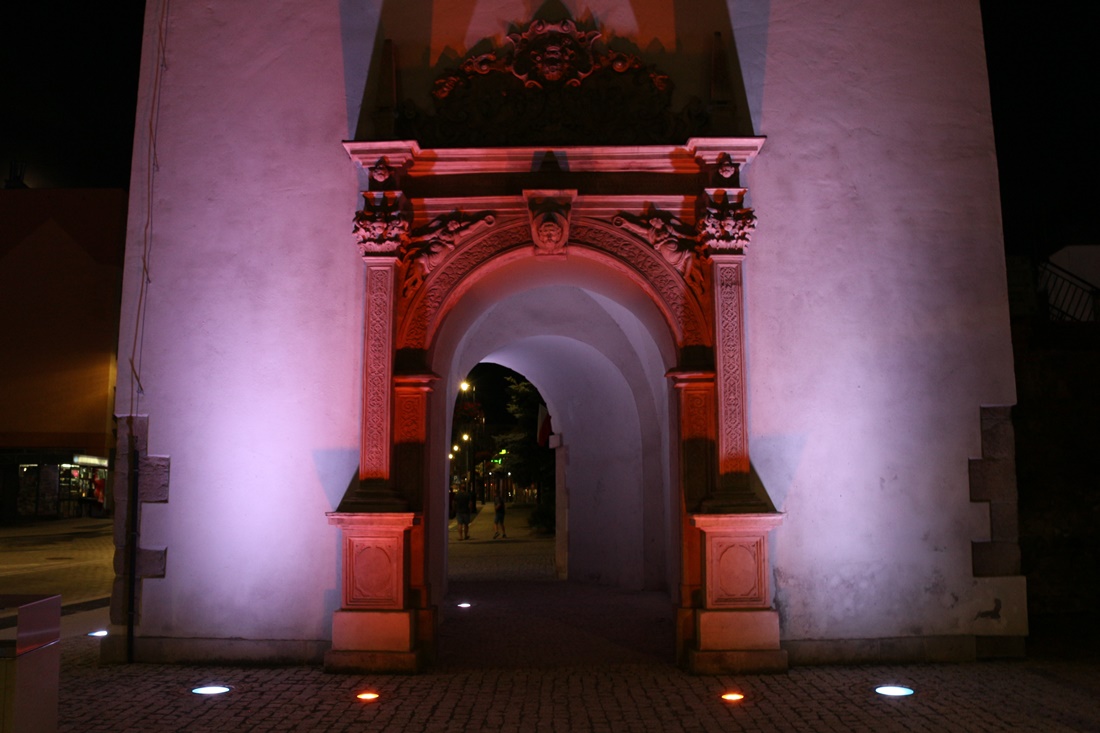Już w styczniu na łamach naszego portalu informowaliśmy o pracach związanych z montażem stałej iluminacji na zabytku. Obecnie wieża jest podświetlona jasnym światłem, a z kolei portal wykonany z piaskowca cieplejszą barwą co idealnie współgra ze sobą. Przy okazji tej inwestycji doświetlono także samo przejście w przyziemiu.